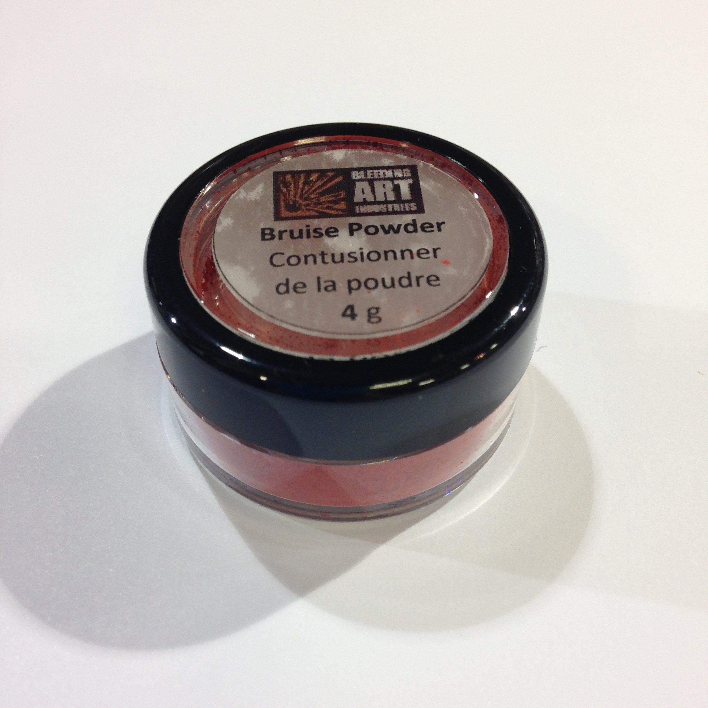 A light weight powder that deepens in colour with the pressure of your finger to simulate realistic bruising. Using a small amount, disperse with a loose brush, and press with finger tips to deepen the red powder to a purple, blackish tone. Good for frostbite as well. Can be applied directly to skin or silicone appliances. Made with cosmetic grade pigments. Can be removed with soap and water. A little goes a very long way. In a convenient 4 g container with a sifter lid for easier application.