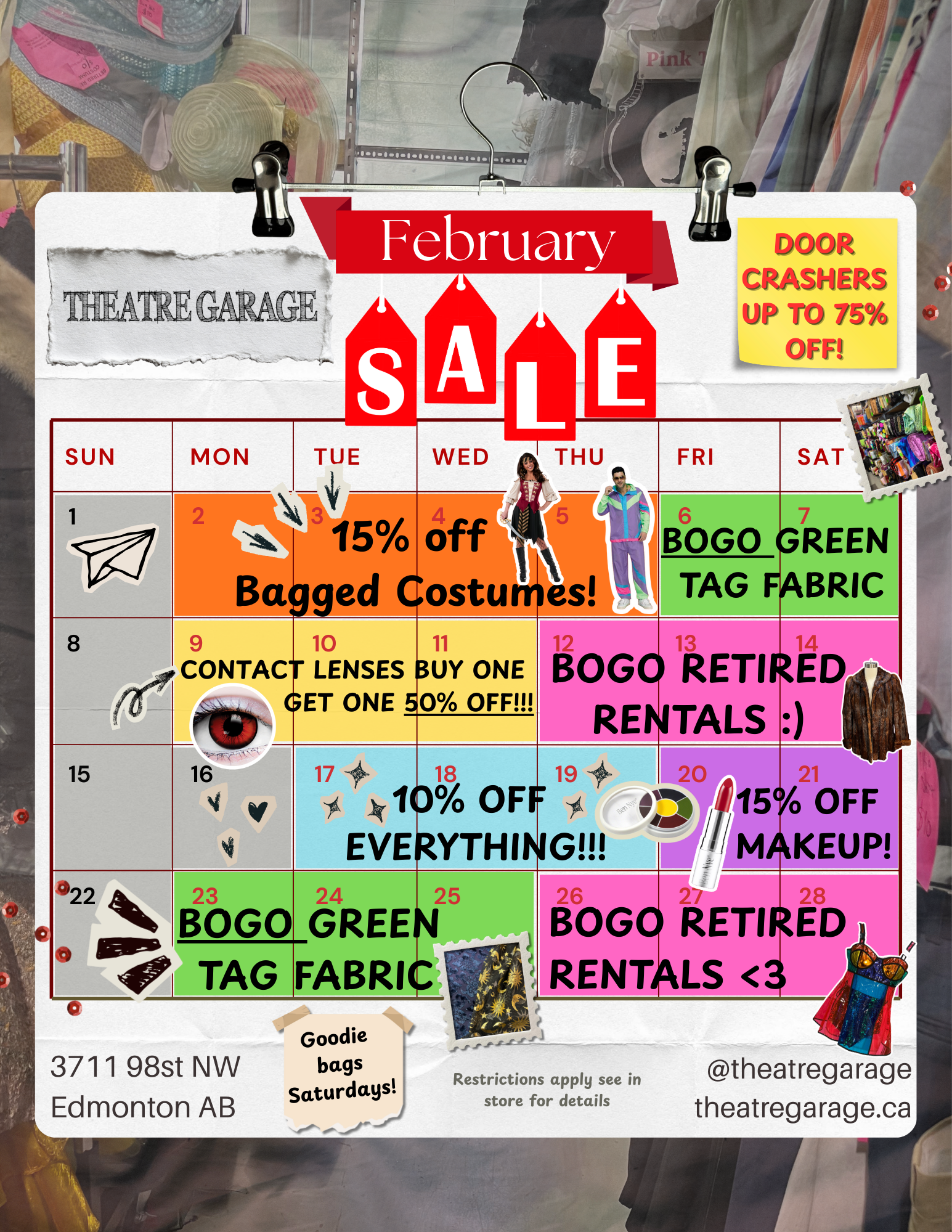 Don’t forget to follow us: WORKSHOPS / EVENTS Upcoming Events Feb 2 February 2 @ 10:00 am - February 5 @ 6:00 pm FEBRUARY SALE! All Bagged costumes are 15% OFF! Feb 6 February 6 @ 11:00 am - February 7 @ 6:00 pm FEBRUARY SALE! BOGO Green Tag Fabrics Feb 9 February 9 @ 10:00 am - February 11 @ 6:00 pm FEBRUARY SALE! Contact Lenses are buy one, get one 50% OFF! Feb 12 February 12 @ 11:00 am - February 14 @ 6:00 pm FEBRUARY SALE! Retired Rentals are BOGO Feb 17 February 17 @ 10:00 am - February 19 @ 7:00 pm FEBRUARY SALE! EVERTHING IS 10% OFF!! View Calendar We Sponsor and are Affiliated with