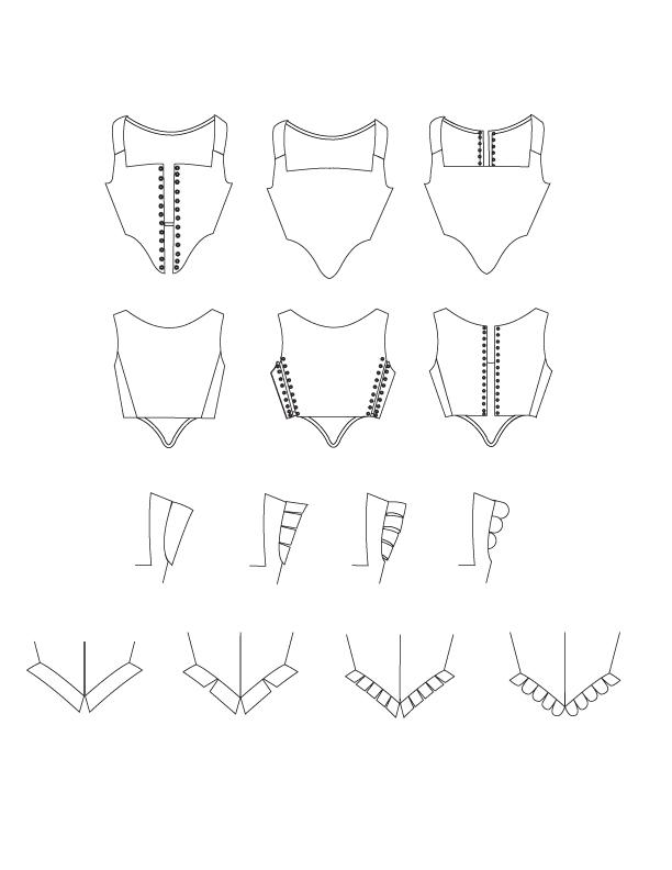 This bodice is suitable for wear by all classes in the years 1565-1600. The pattern can be made up with fastening in the front with hooks and eyes or laces, or with laces at the side backs or center back. Several skirting and shoulder treatment options are included.