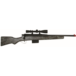 Wood and steel toy rifle with plastic scope. 28.5" long