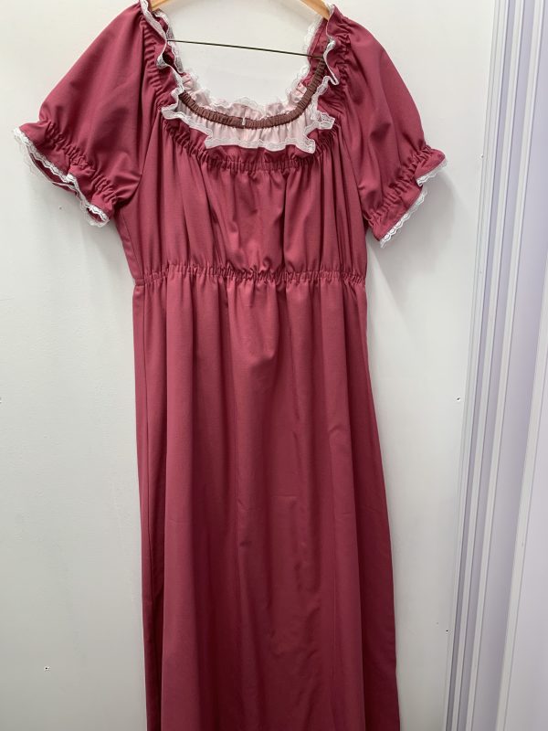 -Dusty pink poly/cotton dress with gathered capped sleeves and white lace