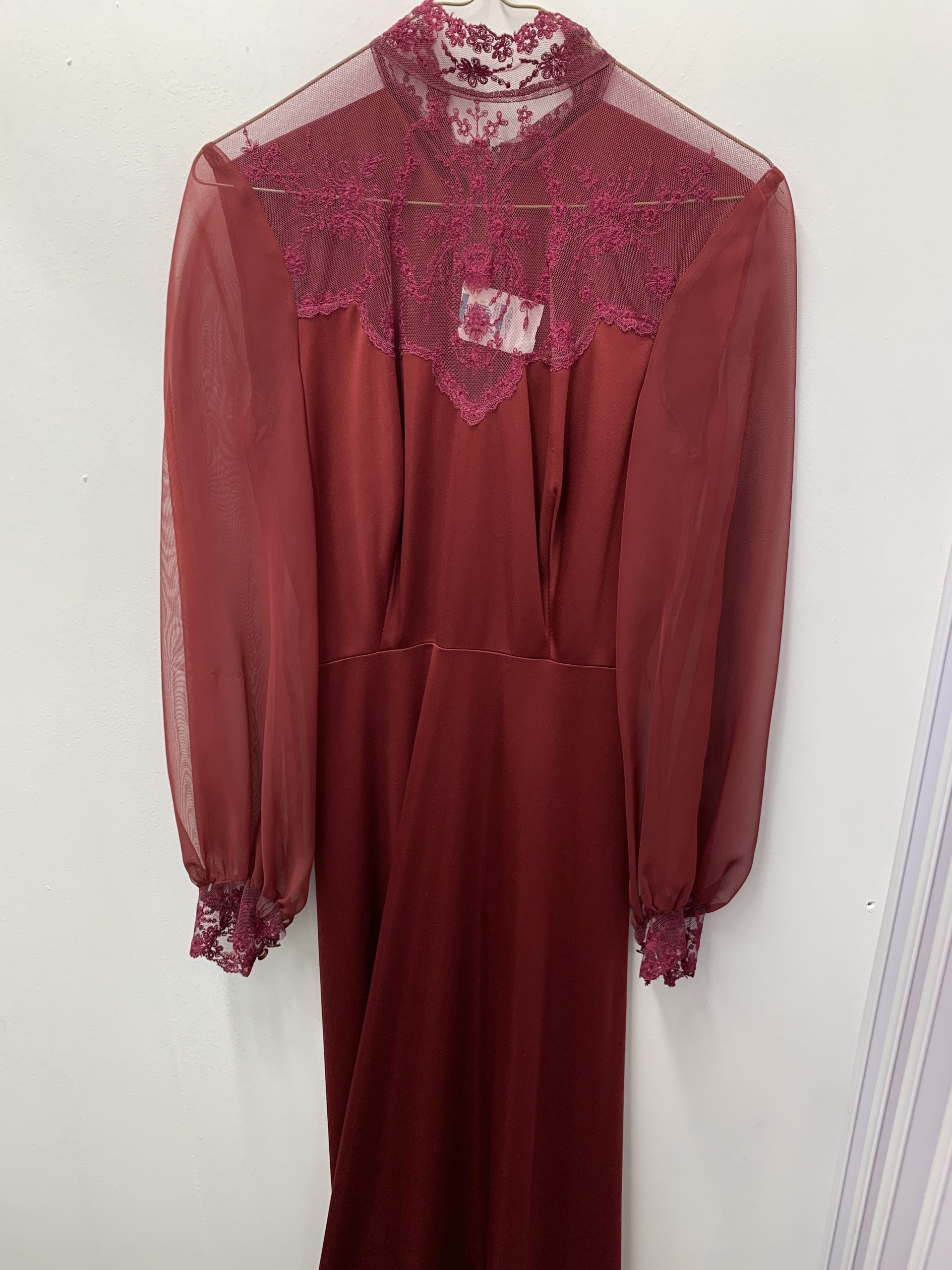 - Burgundy dress with sheer sleeves and lace neckline