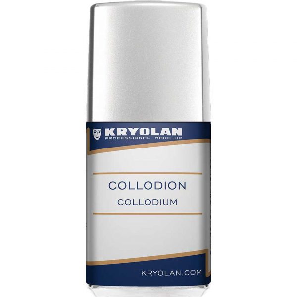 Collodion is a classic product for creation of simulated scars (also known as Scarring Material). Collodion, which dries extremely fast, is first coated onto the skin. The skin is then pressed together to form a fold. The optical impression of a scar results. Collodion contains ether and acts to degrease the skin. After being used, the skin should be treated with cream that contains fat, and the skin should be protected from being stressed. Remove with Collodion Remover.