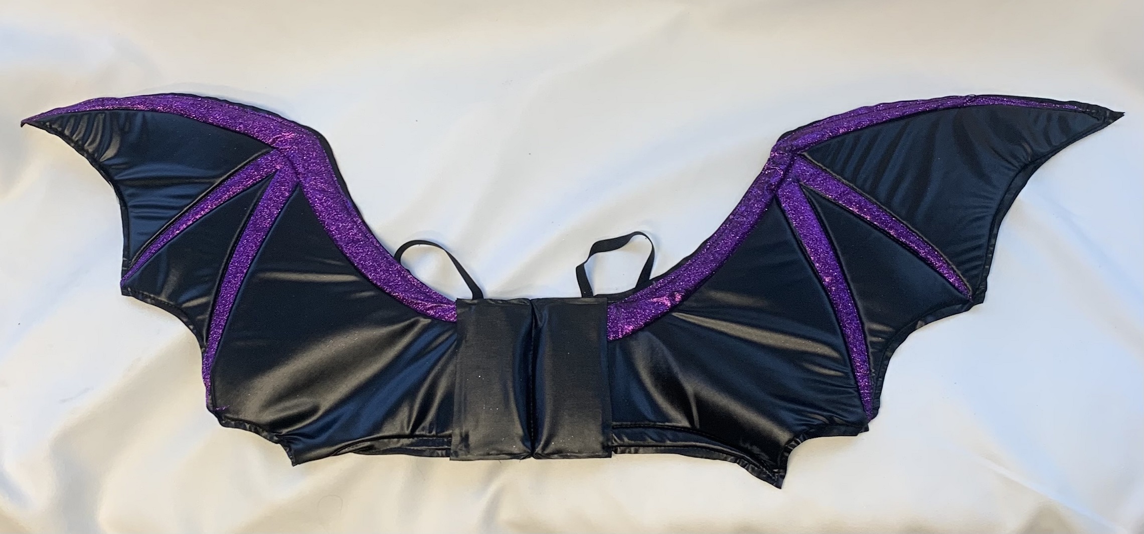 These wings are black satin with sparkle purple trim. They have black elastic arm straps. They measure 112cm across and 35cm tall.