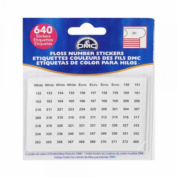 A set of small pre-printed, self-stick labels that can be adhered to DMC Cardboard and Plastic Bobbins to identify DMC Embroidery Floss colors.