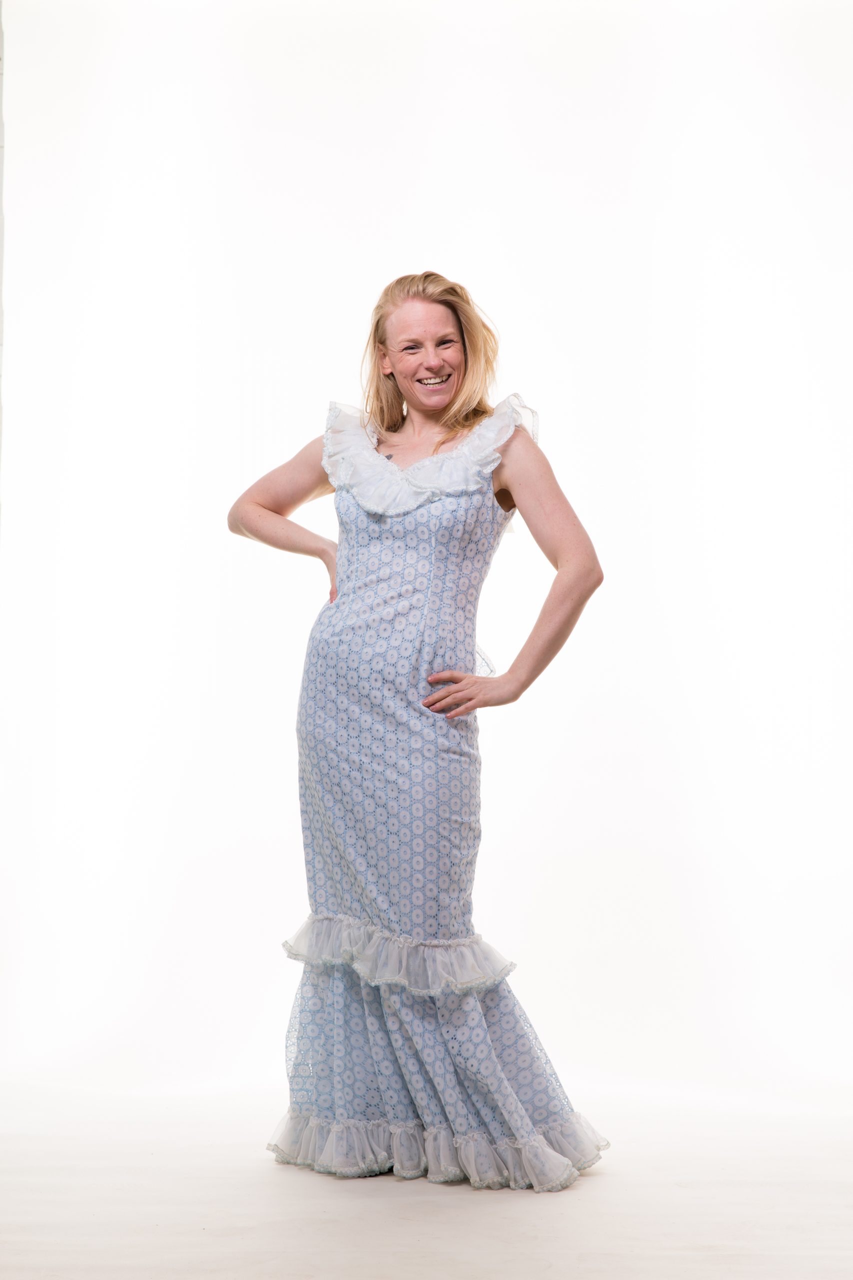 - Sky blue Klondike dress, with white laced ruffles, and bow on back