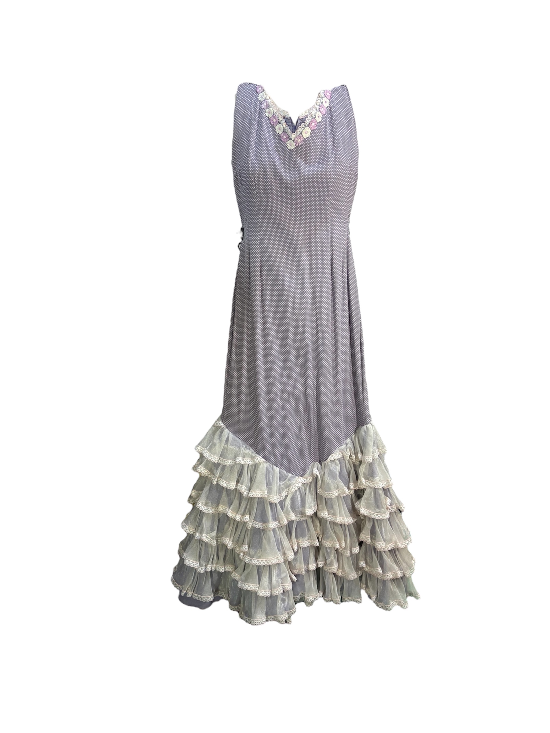 - Purple lace Klondike dress, with floral lace overlay, and lace ruffles
