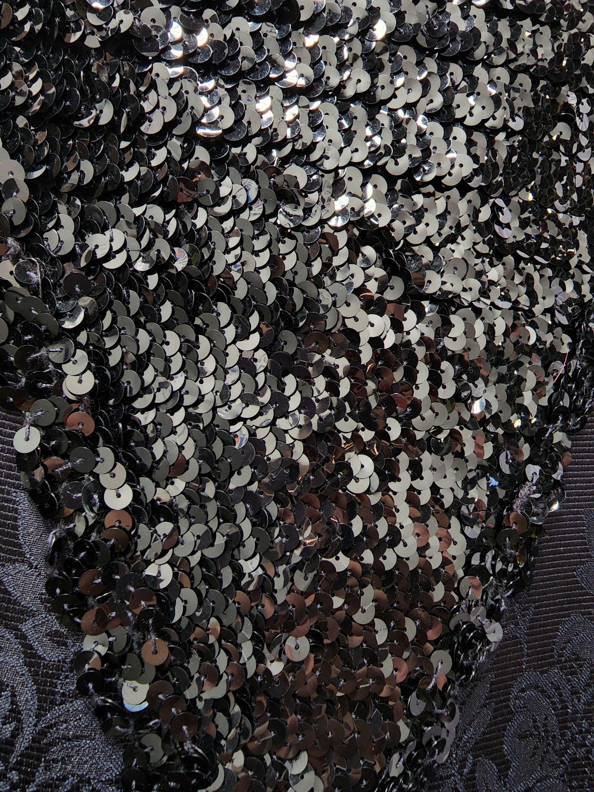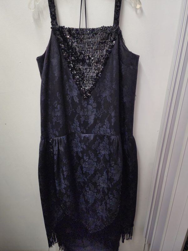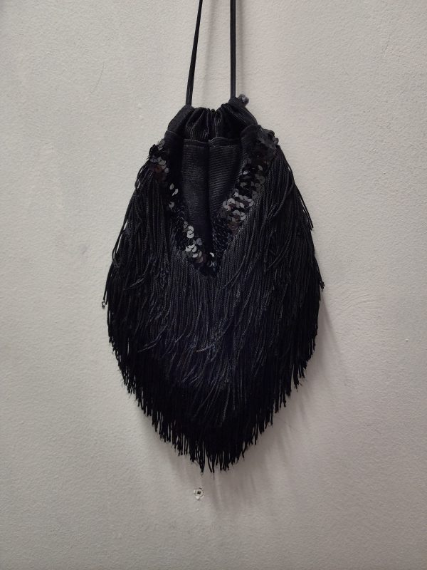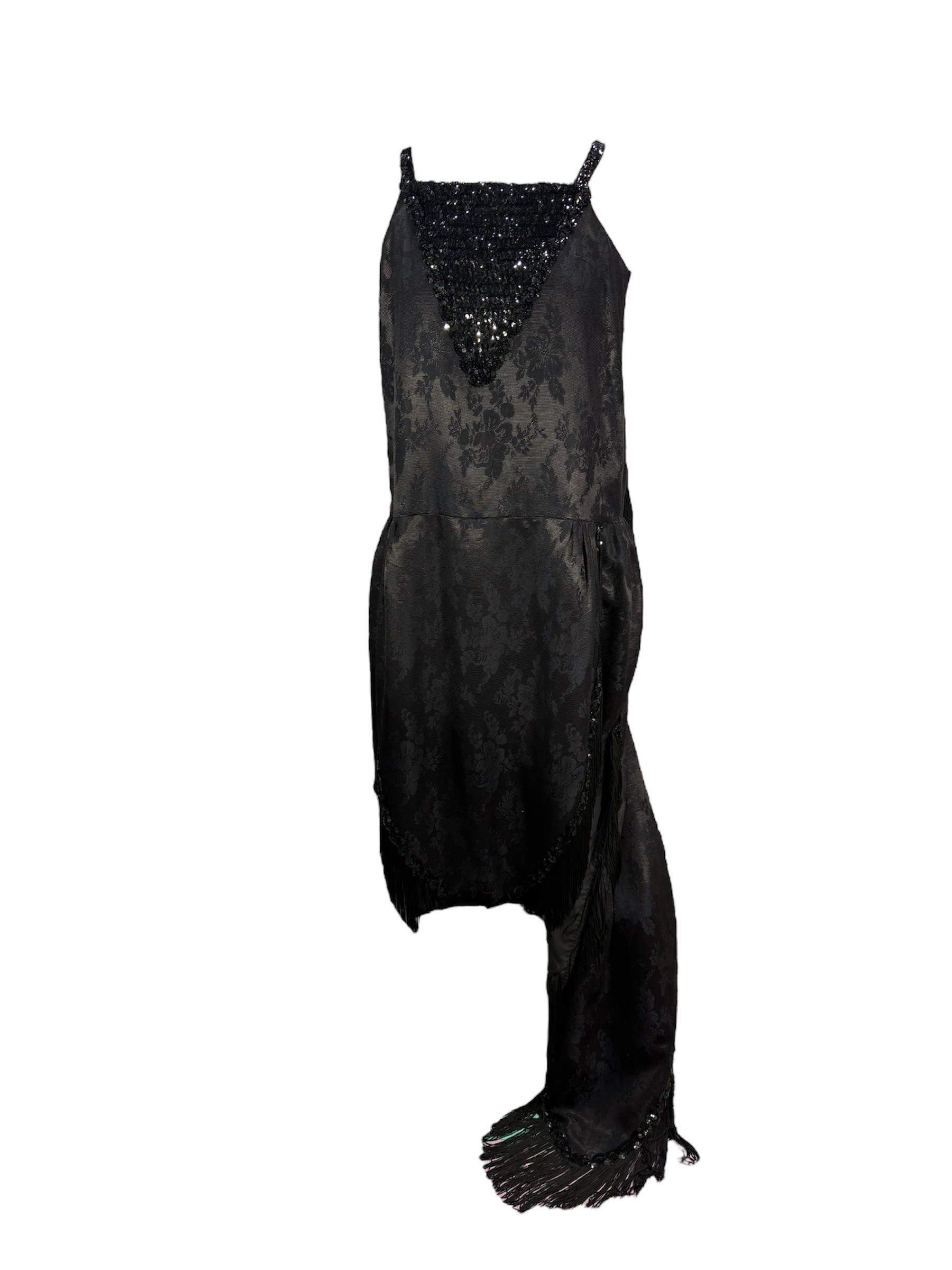 - Long black sleeveless gown with fringe sequins and train