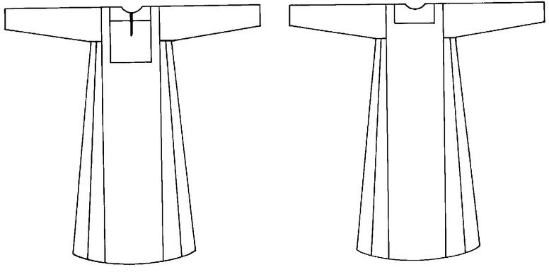This ankle-length gown is composed of easy-to-construct panels that are perfect for pieced or handwoven fabric variations, needlework, and other embellishment. Create an heirloom with one of the traditional embroidery designs included in the pattern.
