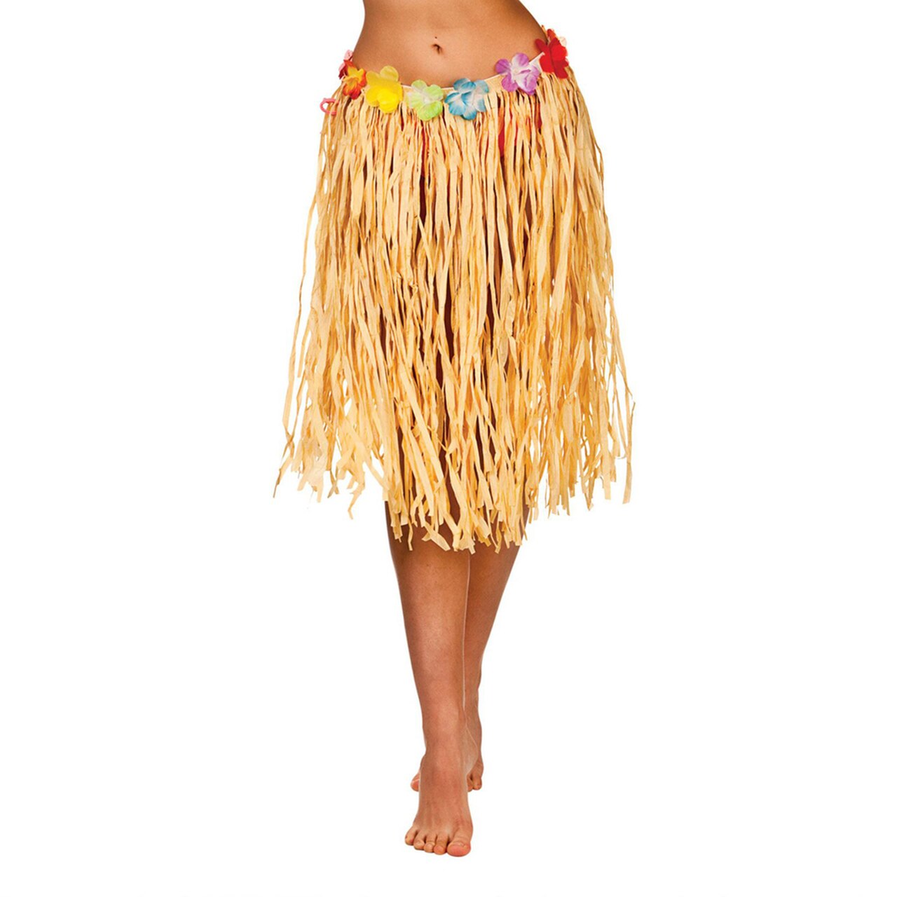 Grass skirt made of plastic fibers with elastic waist.