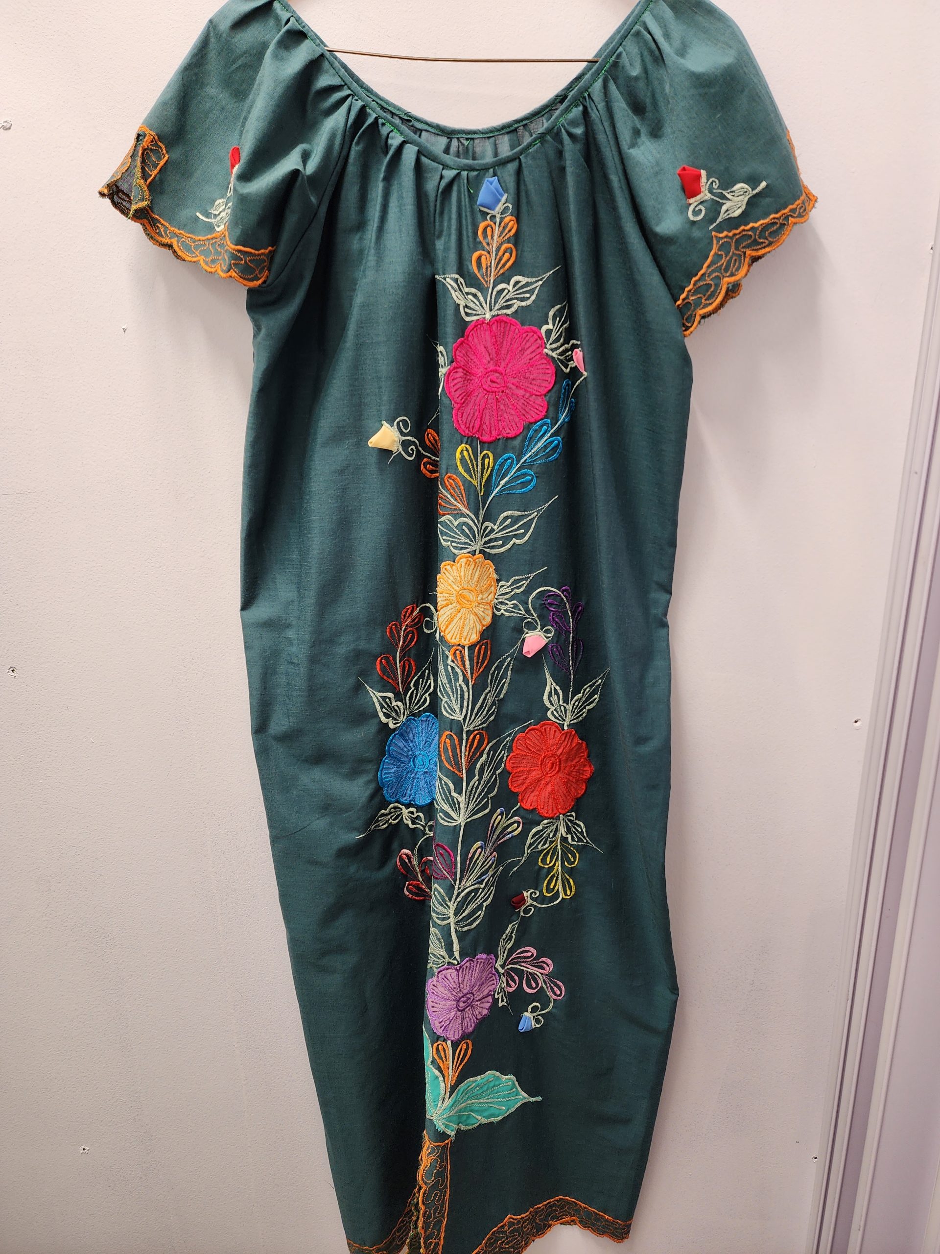- Dark green dress with large embroidered flowers