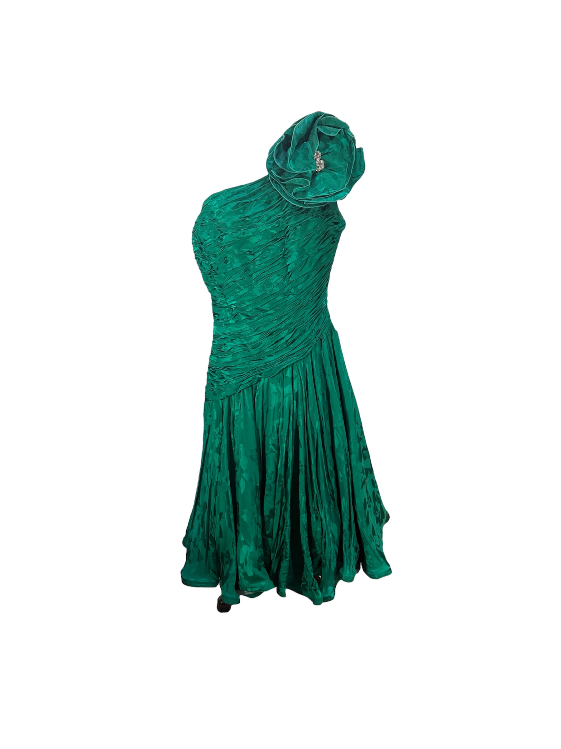 - Green satin floral one shoulder dress with oversized flower at shoulder