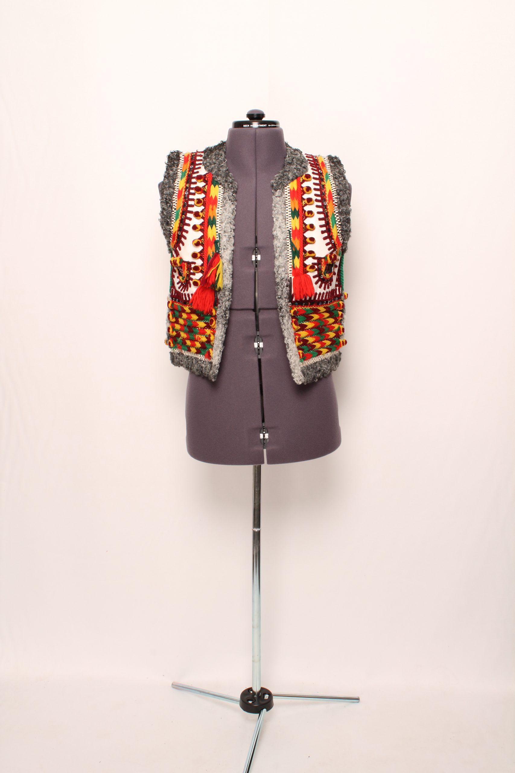 -Short multicolored vest with grey wool trim