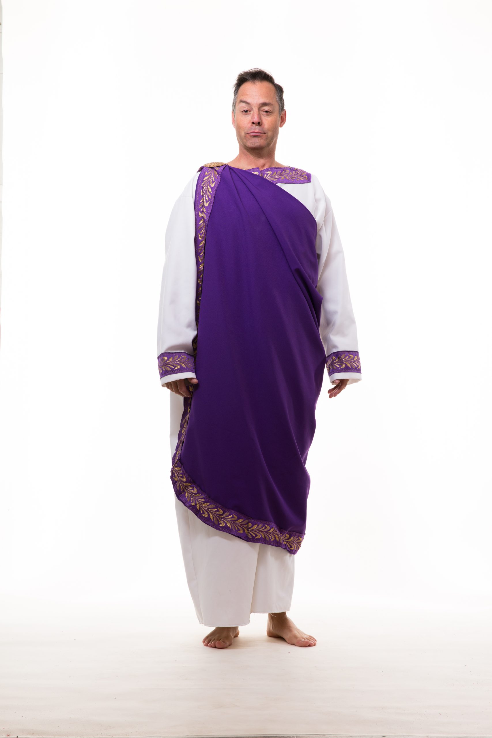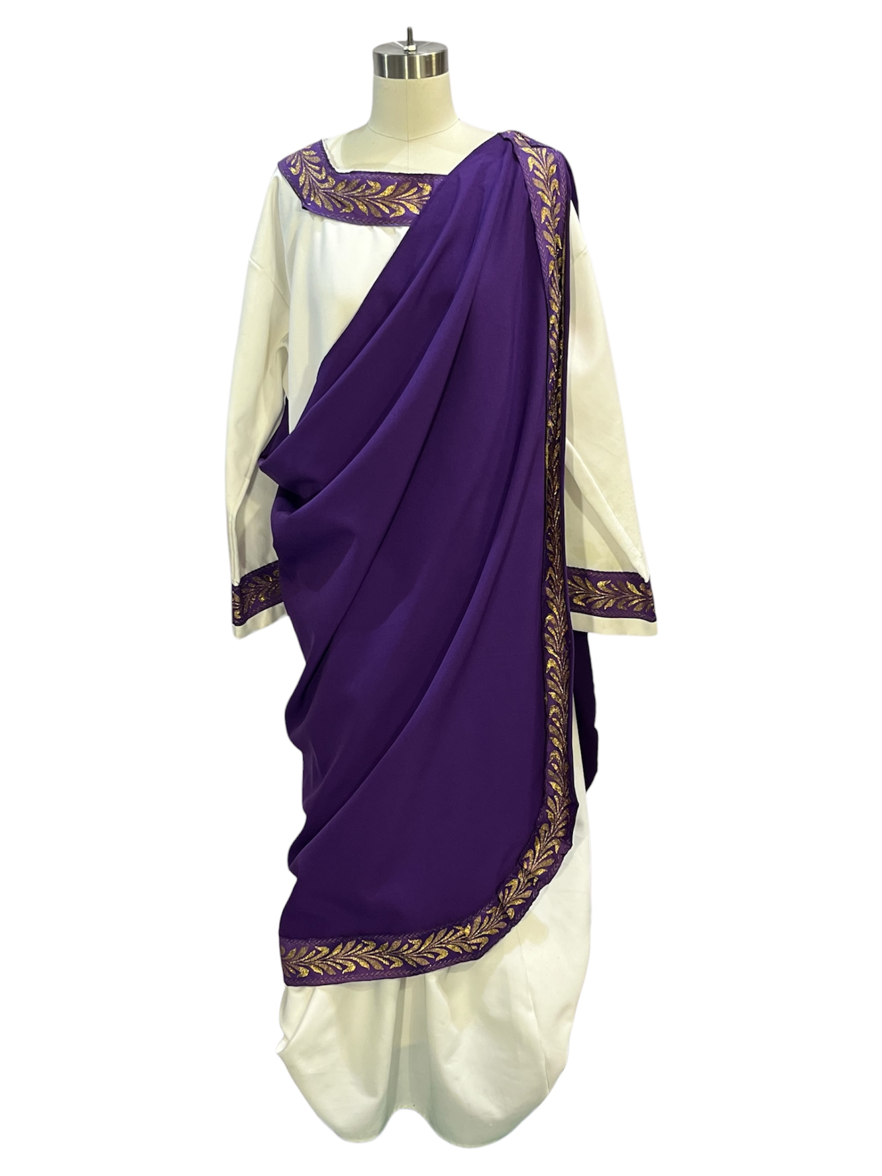 -White tunic with purple trim