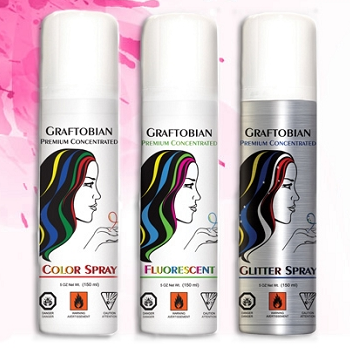 Graftobian color sprays are an all new formula for premium, concentrated hair color. These washable hair sprays provide total coverage. To add a little sparkle add a layer of Graftobian's Glitter Hair Spray overtop.