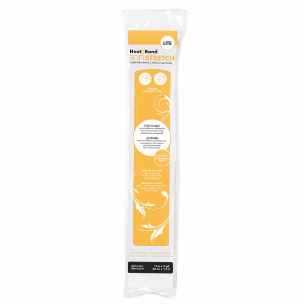 HeatnBond Soft StretchTM Lite is a sewable, permanent, lightweight iron-on web adhesive specially designed to move with your stretch fabric while maintaining a strong bond! There is no added bulk and maintains a soft hand after fusing. Great to use with appliques, knits, stretch denim, spandex, jersey fabrics, fleece and flannel. Machine wash cold delicate cycle and tumble dry on low heat or no heat. Dry Cleanable. Avoid repeated or excessive ironing to the area after fusing. 43cm x 1.8m (17″ x 2yd) roll.
