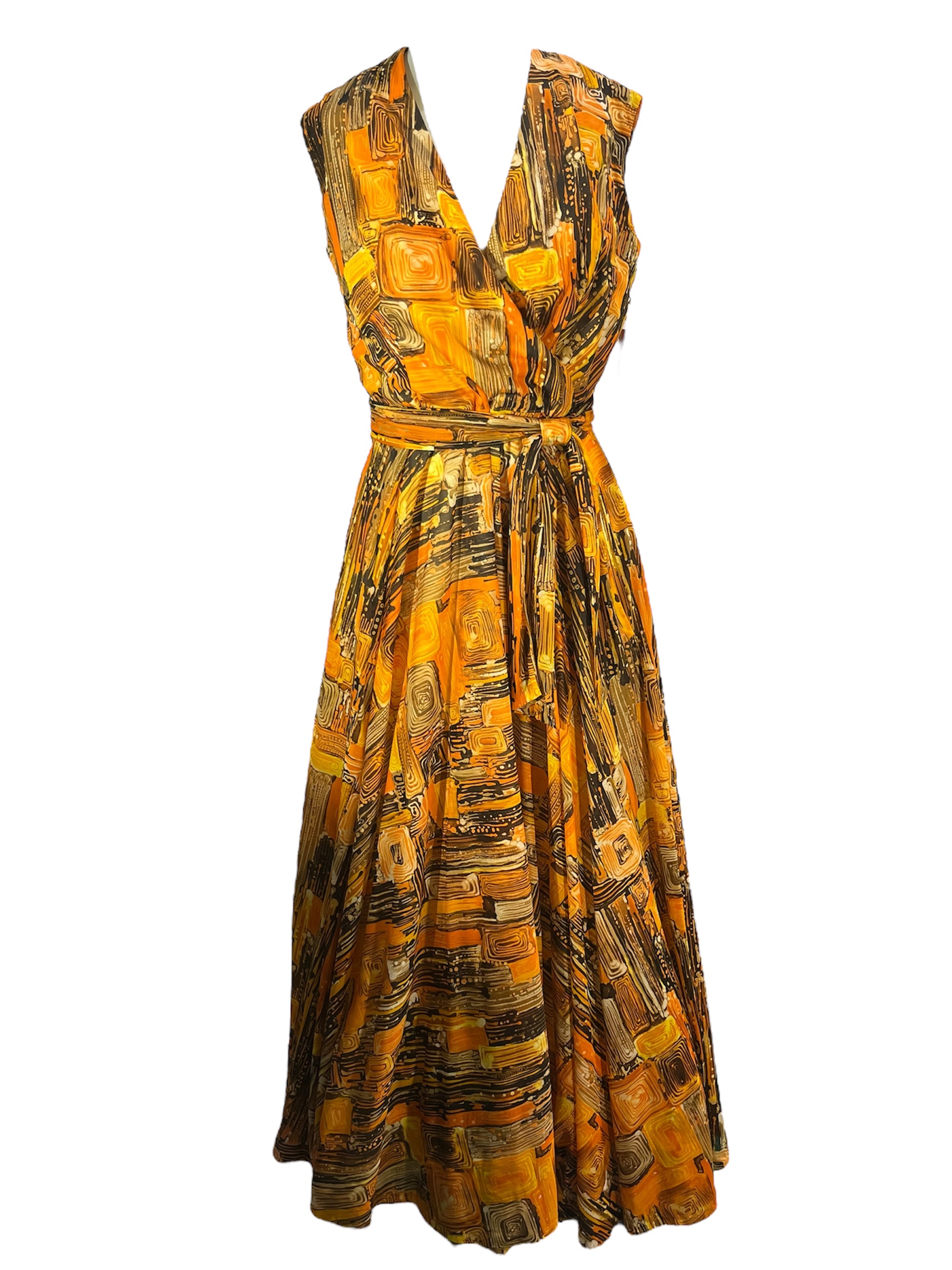 -Long orange, brown and yellow dress with spiraled rectangle pattern