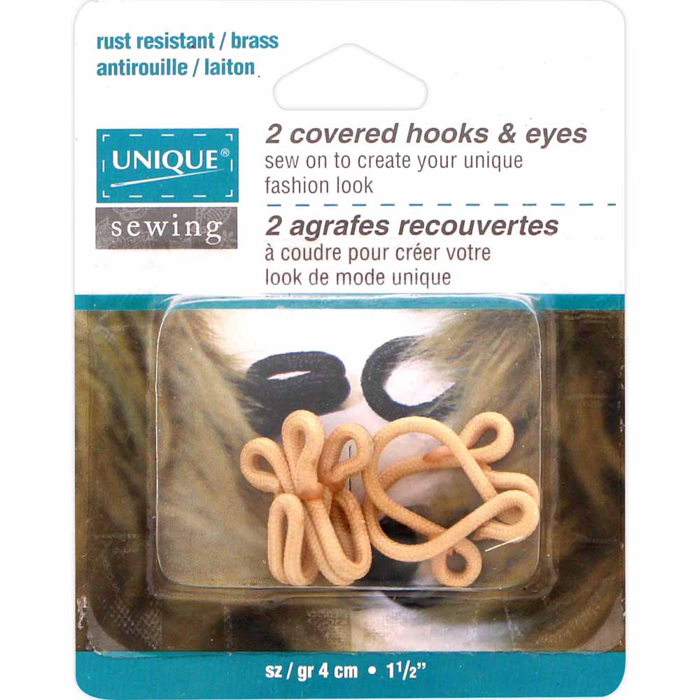 Hooks and eyes covered in beige fabric.