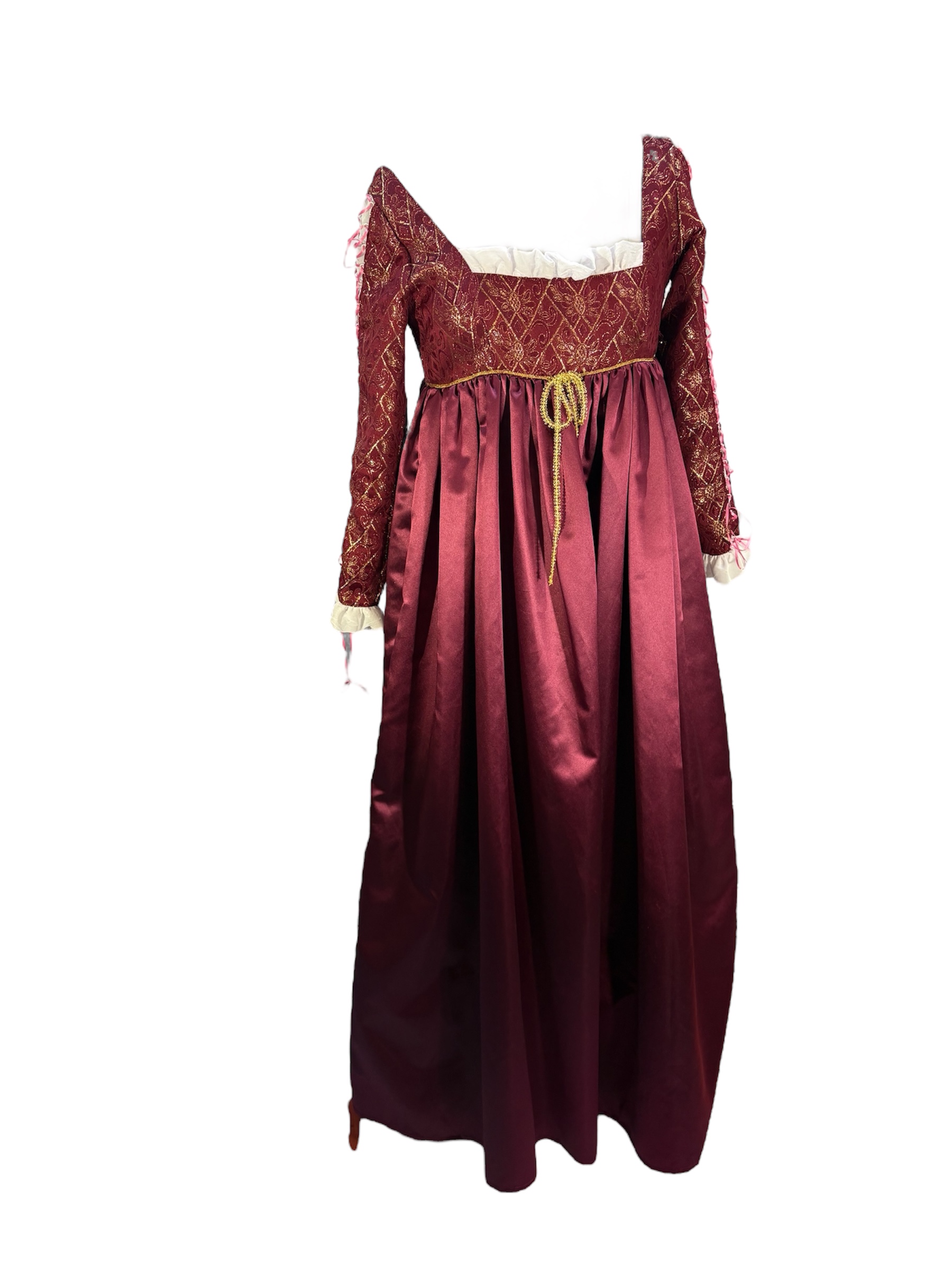 - Long sleeve burgundy satin empire waist dress with lace up sleeves.