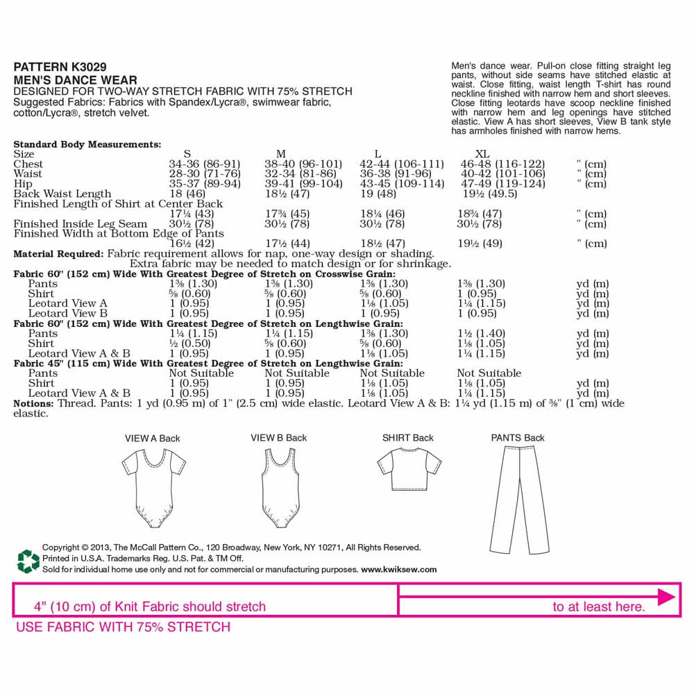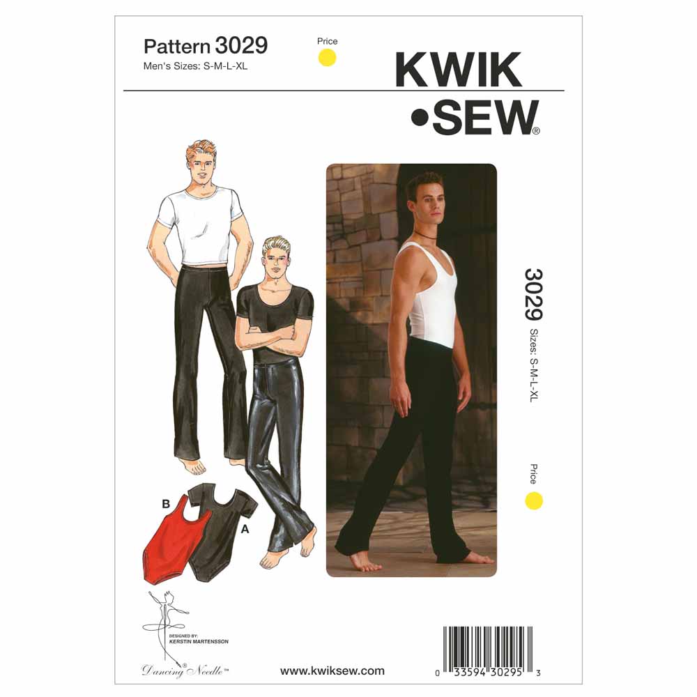 The Men's Dance Wear is designed for two-way stretch fabric with 75% stretch. We suggest fabrics with Spandex/two-way stretch fabric, swimwear fabric, cotton/two-way stretch fabric or stretch velvet. Men's dance wear. The pull-on close fitting straight leg pants, are designed without side seams and have stitched elastic at the waist. The close fitting, waist length T-shirt has a round neckline finished with a narrow hem and short sleeves. The close fitting leotards have a scoop neckline finished with a narrow hem and the leg openings have stitched elastic. View A: has short sleeves, the View B: tank style has armholes finished with narrow hems.