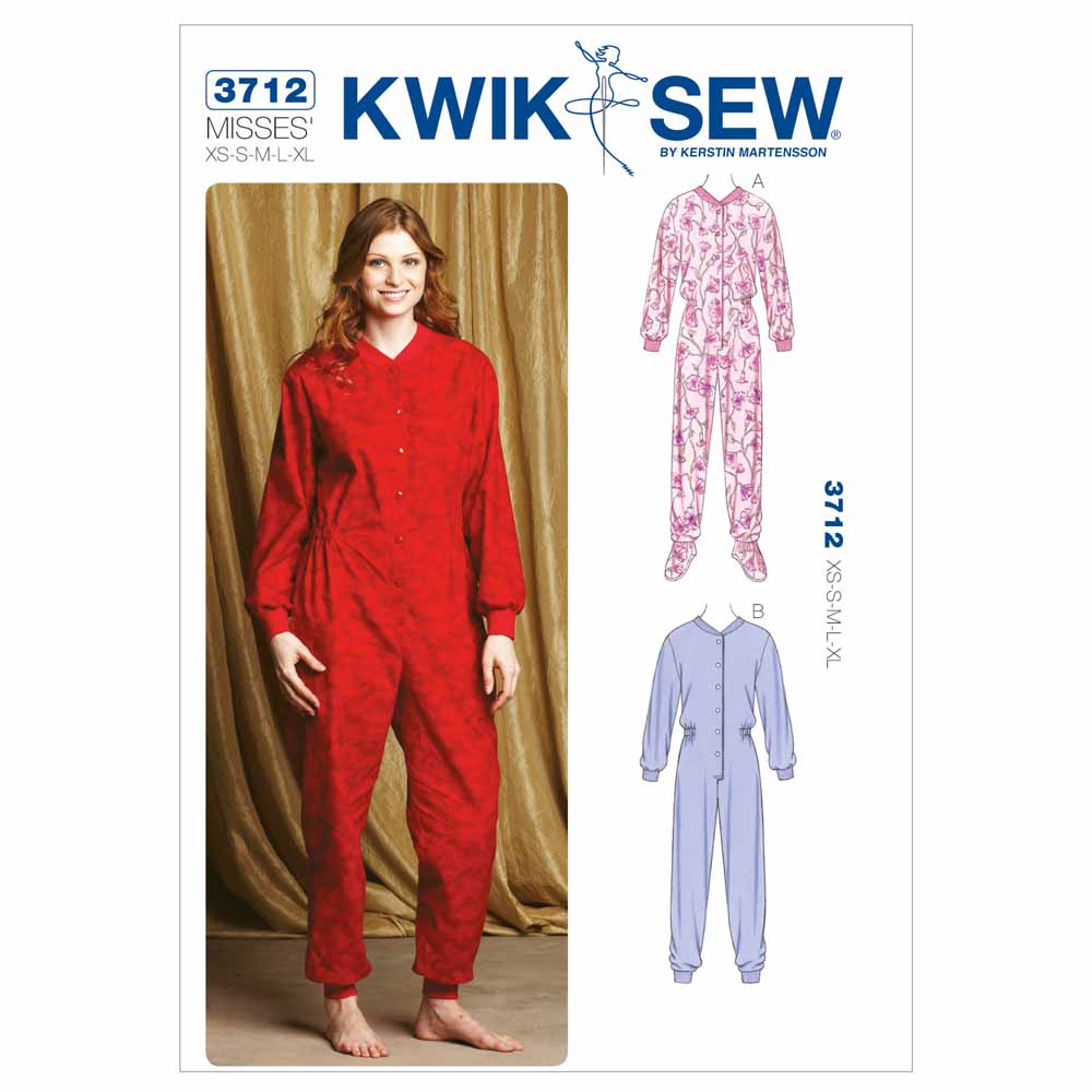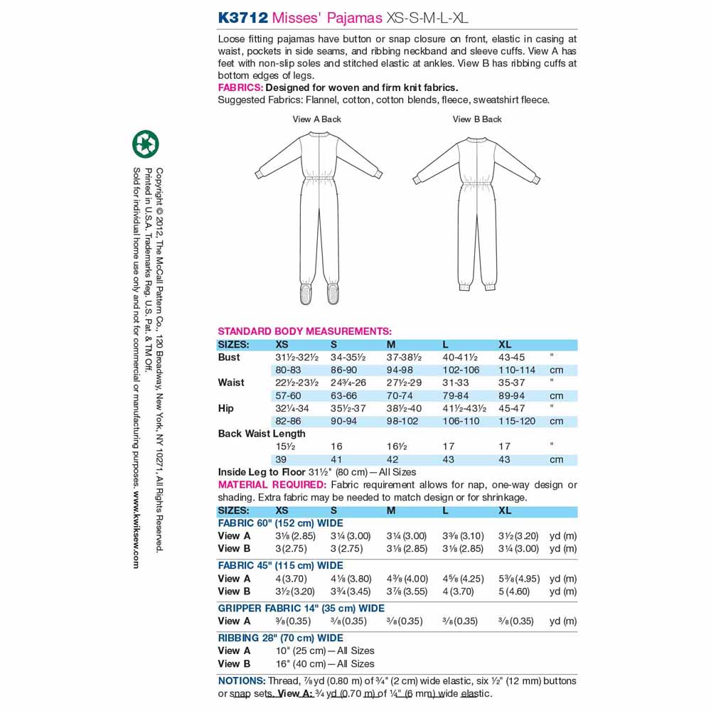 FABRICS: Designed for woven and firm knit fabrics. Suggested Fabrics: Flannel, cotton, cotton blends, fleece, sweatshirt fleece. Loose fitting pajamas have button or snap closure on front, elastic in casing at waist, pockets in side seams, and ribbing neckband and sleeve cuffs. View A: has feet with non-slip soles and stitched elastic at ankles. View B: has ribbing cuffs at bottom edges of legs.
