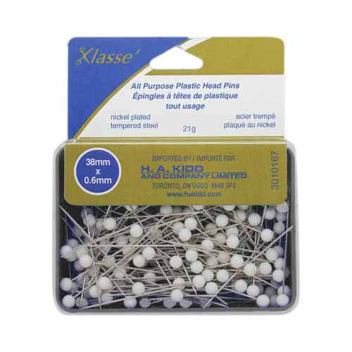 General purpose pins for medium weight fabrics with solid white heads. Exceptionally smooth and rust resistant with higher tensile strength than other pins. Made of nickel plated tempered steel which can be picked up magnetically.