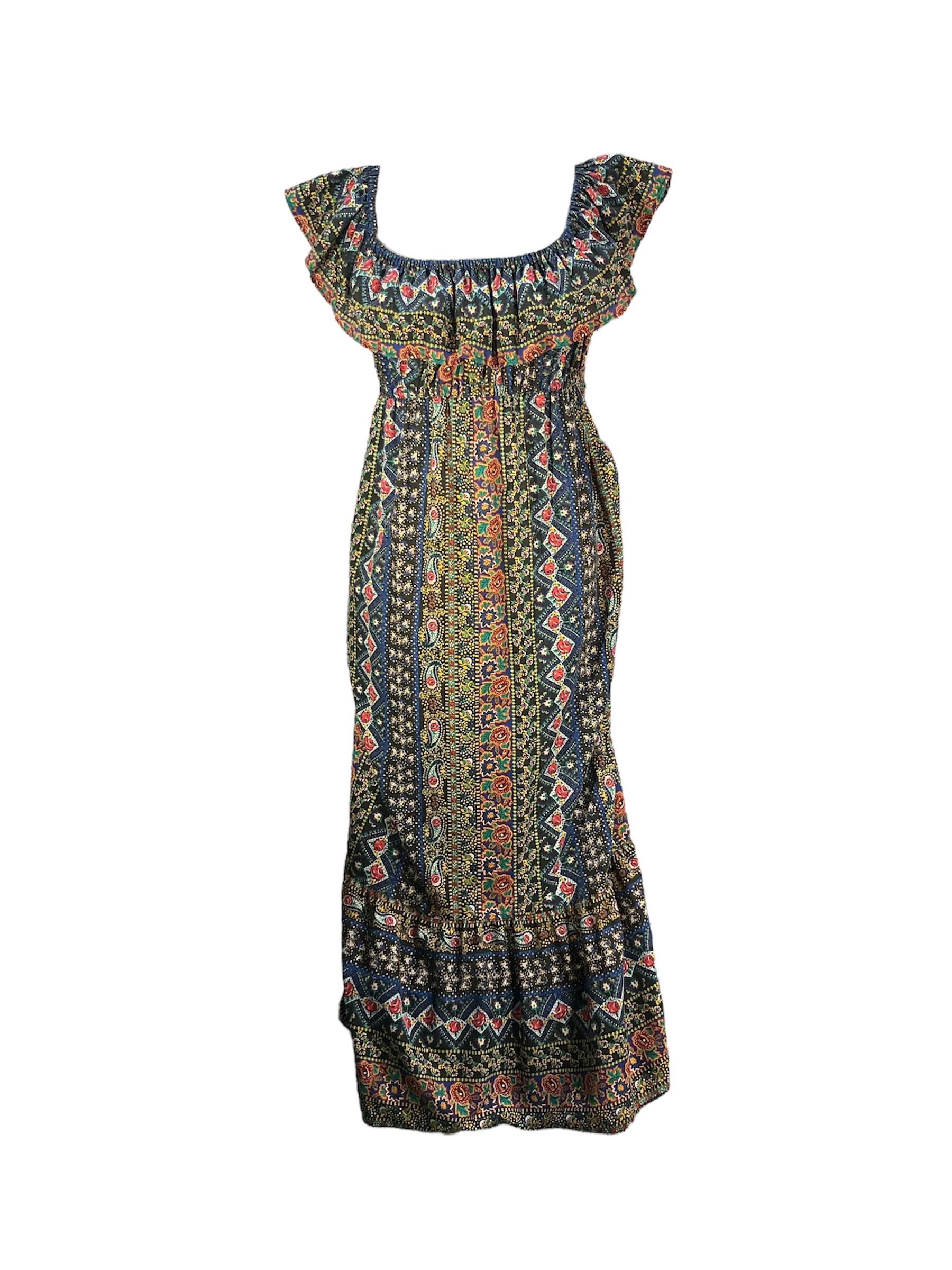-Long multi-pattern floral and paisley dress with ruffle along neckline and hem.