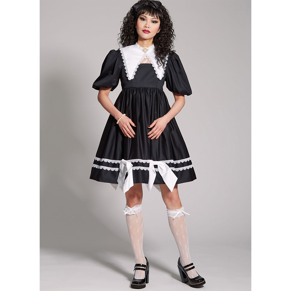 retty dresses with square neckline have back zipper, short puffed elasticized sleeves or long puffed sleeves with wide cuffs. Dresses have full gathered skirts with or without lower ruffle. Design options include sheer overlay, lace and ribbon trims, fabric bows, dickie, and ruffled collars.