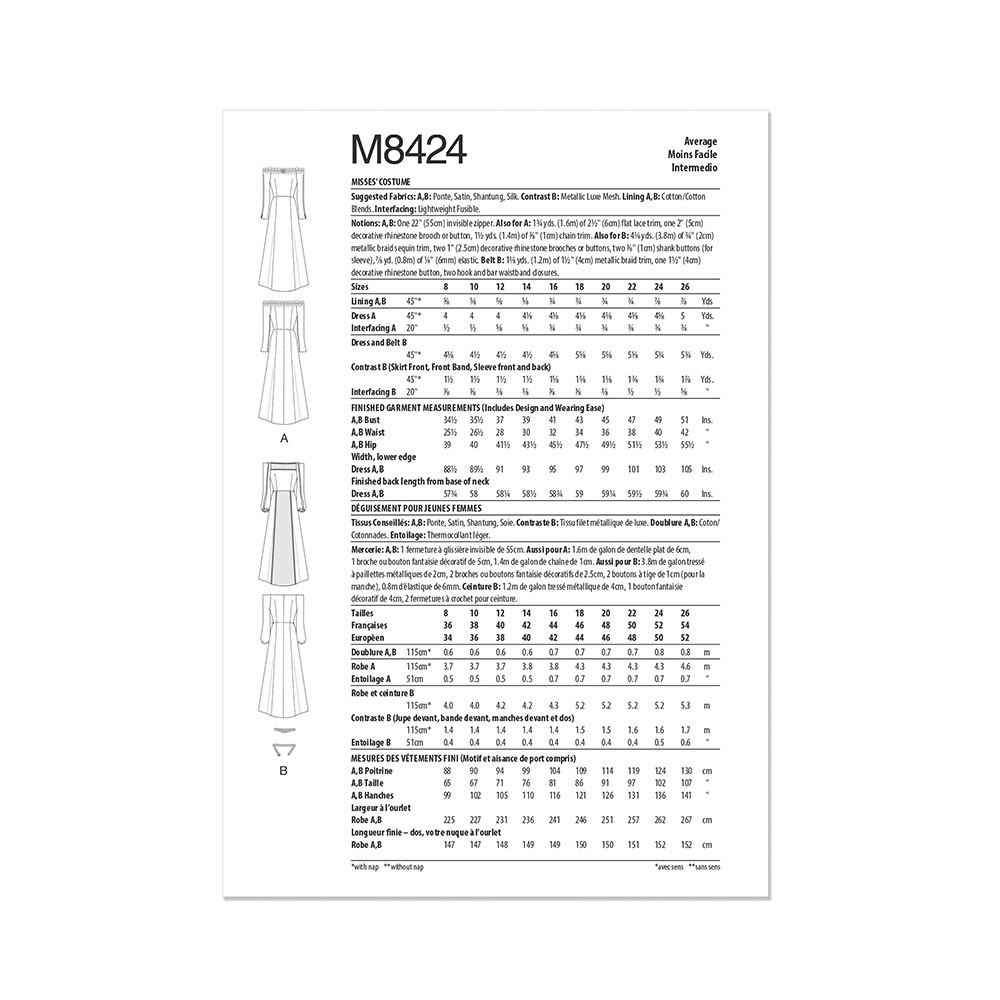 Long dresses have fitted bodice with front and back darts and flared skirt. Both dresses are off the shoulder sleeves. Dress B has separate belt.