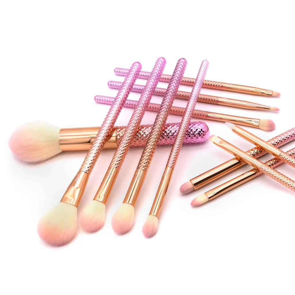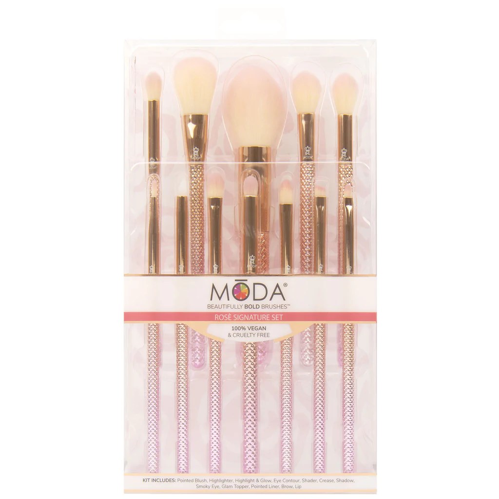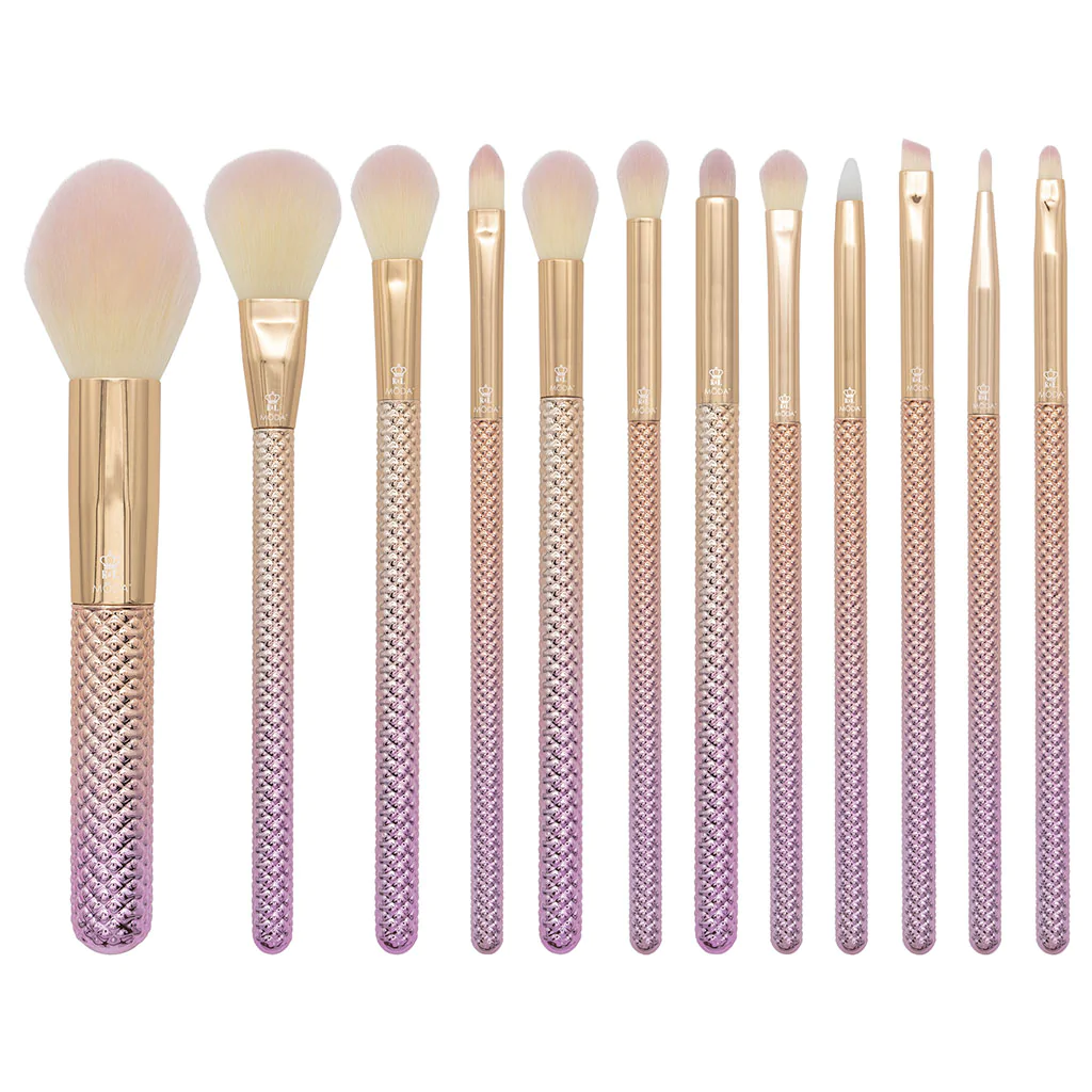 This twelve piece Rosé Signature Set is the ultimate selection of complexion and eye brushes, in a lovely ombre, metallic style. These brushes feel as soft and gentle as they look. Allow these brushes to elegantly apply powders, shadows, and more!