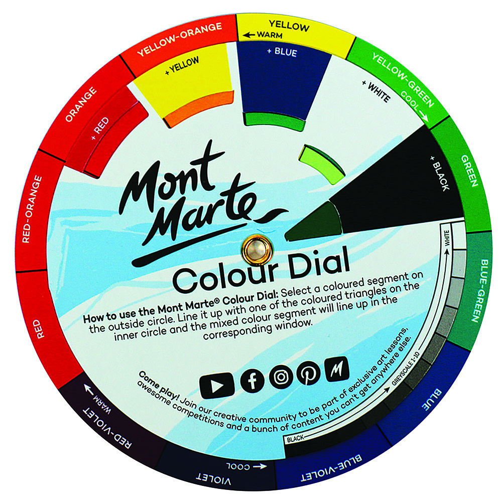 The Mont Marte Mini Colour Dial offers a fantastic colour mixing guide for artists. This colour wheel allows you to select a colour, line it up with another colour and see what happens when you mix them together. It also teaches you the difference between primary colours, secondary colours, tertiary colours, hue, value and intensity. It provides an instant colour mixing preview to help you create the colours you need for your projects.