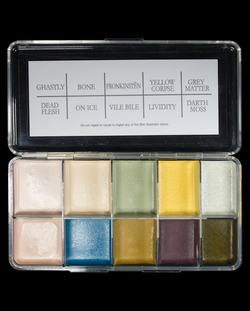 The Skin Illustrator Palettes are durable, water and abrasion resistant alcohol activated make-up. Created by professionals for professionals, Skin Illustrator is designed to speed up the process of color application and touch ups by greatly reducing the need to mix colors. The wide range of colors allow you total control to create any illusion imaginable. Skin Illustrator will cover tattoos, create effects, color hair, and it can be used on skin, foam latex, gelatin, plastic and silicone appliances The high pigment content provides rich color tones that stay in place and last all day.