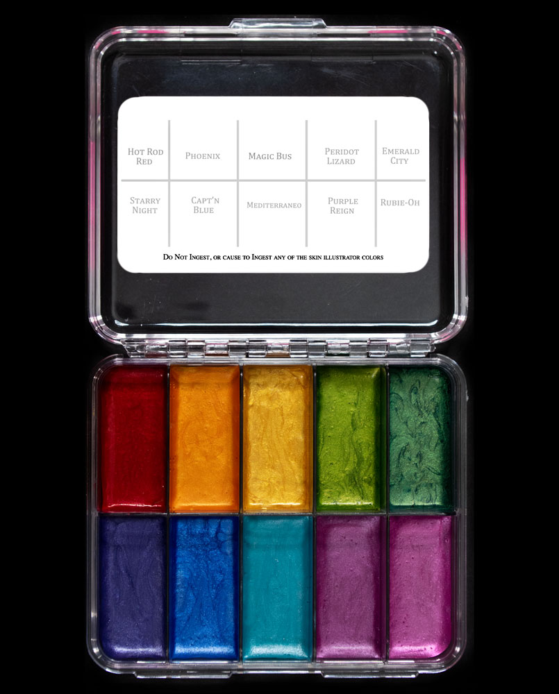 The Skin Illustrator Palettes are durable, water and abrasion resistant alcohol activated make-up. Created by professionals for professionals, Skin Illustrator is designed to speed up the process of color application and touch ups by greatly reducing the need to mix colors. The wide range of colors allow you total control to create any illusion imaginable. Skin Illustrator will cover tattoos, create effects, color hair, and it can be used on skin, foam latex, gelatin, plastic and silicone appliances The high pigment content provides rich color tones that stay in place and last all day.