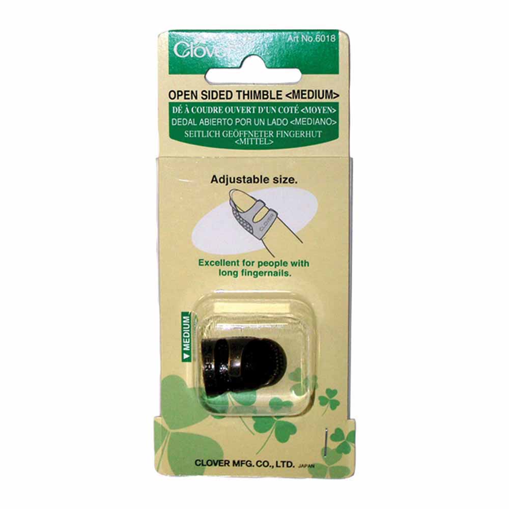 Open sided thimble size medium. Easily adjusts to the comfort of your finger. Designed with an open top to keep your finger from perspiring. Dimpled for easy use on needles. Suitable for people with long fingernails.