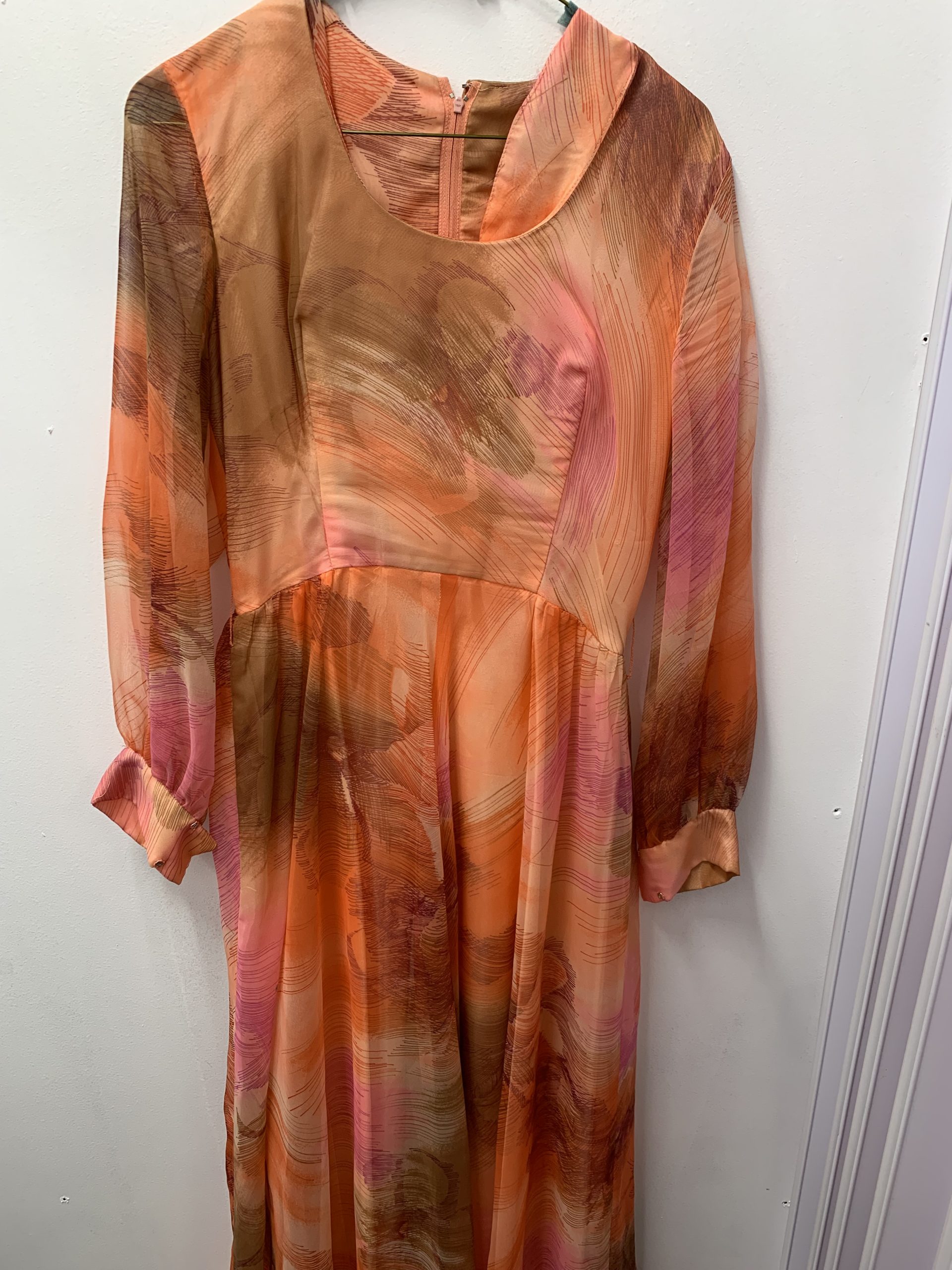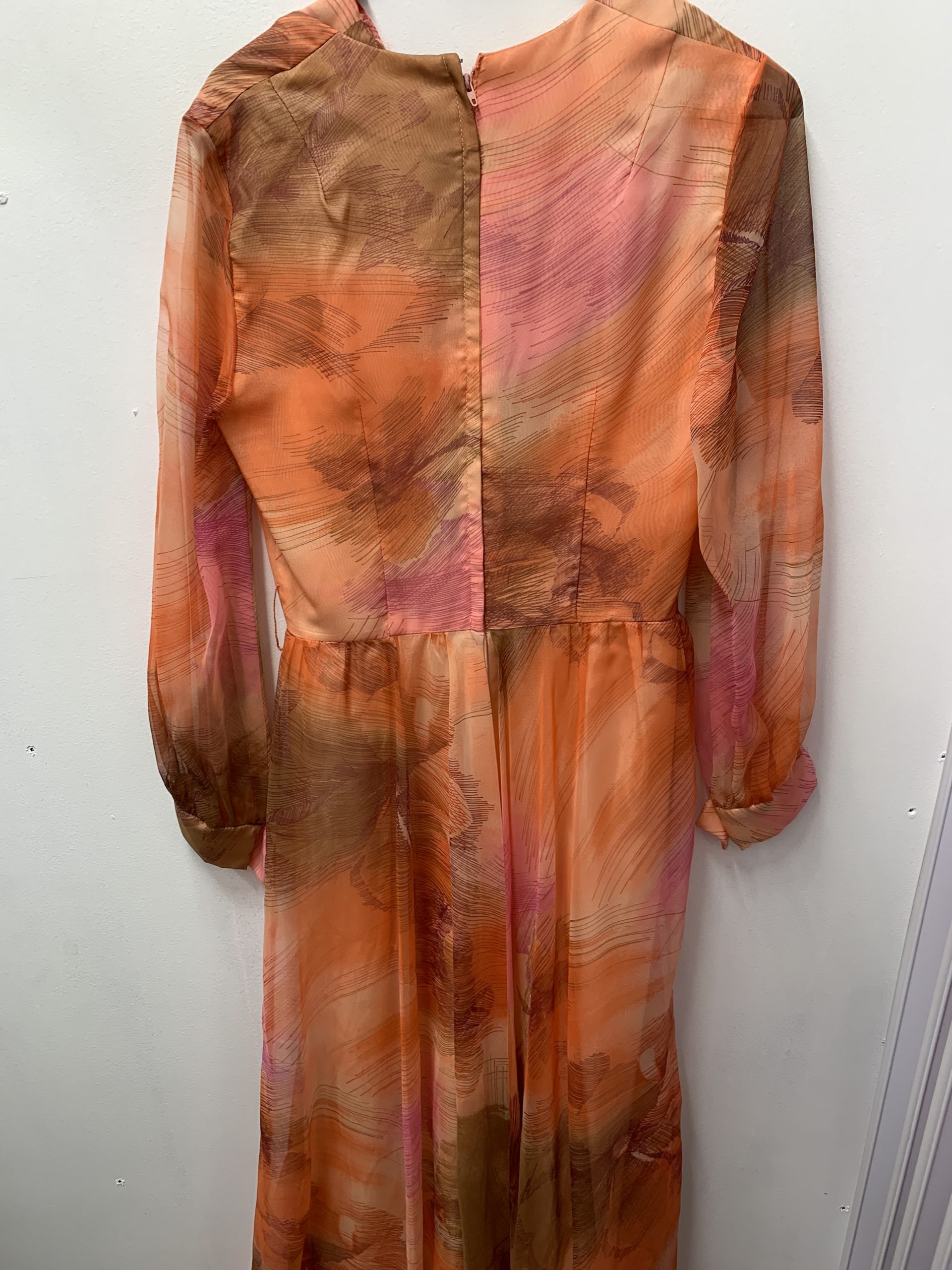 - Long Sleeve orange pink and brown dress with sketched floral pattern