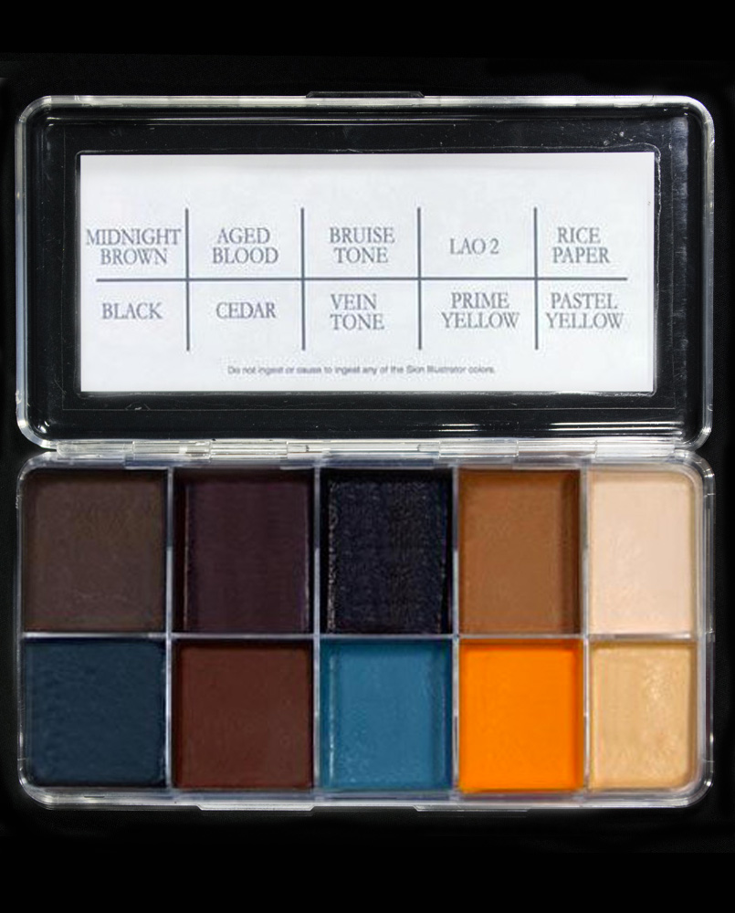 The Skin Illustrator Palettes are durable, water and abrasion resistant alcohol activated make-up. Created by professionals for professionals, Skin Illustrator is designed to speed up the process of color application and touch ups by greatly reducing the need to mix colors. The wide range of colors allow you total control to create any illusion imaginable. Skin Illustrator will cover tattoos, create effects, color hair, and it can be used on skin, foam latex, gelatin, plastic and silicone appliances The high pigment content provides rich color tones that stay in place and last all day.