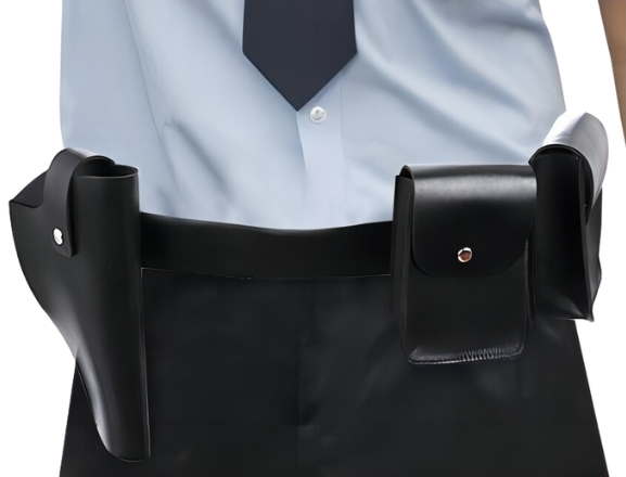 Leather like belt with 2removable pouches and holster. Fits approximately a 36"-45" waist.