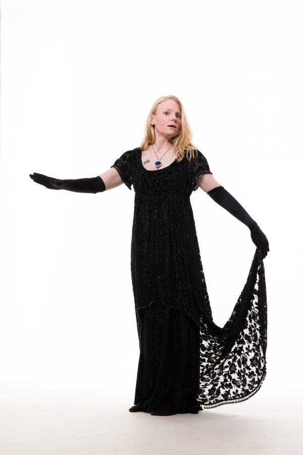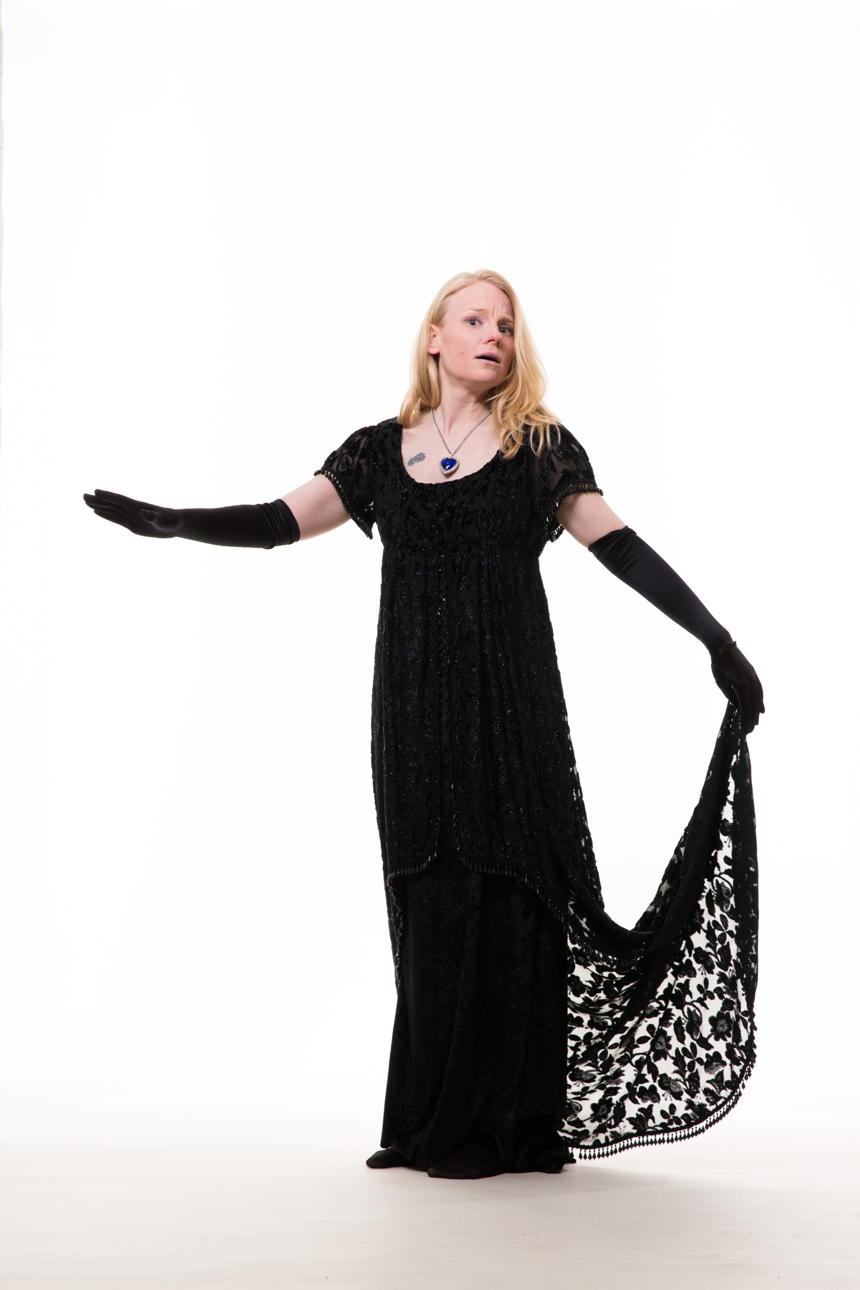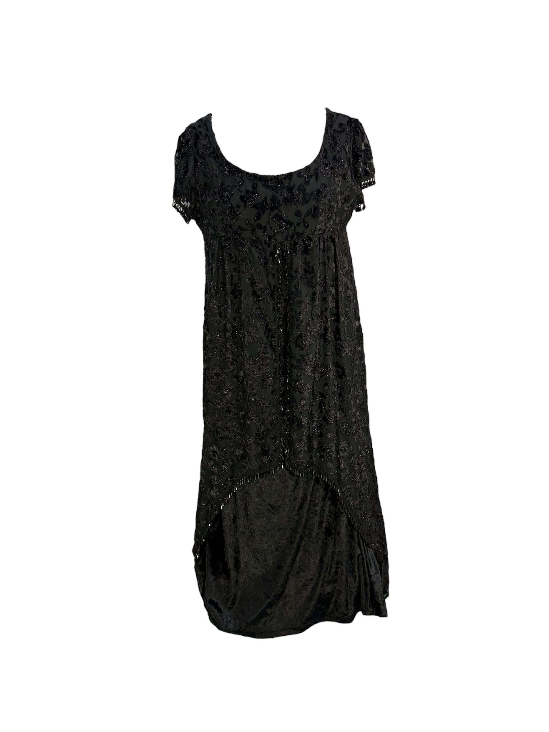 - Beaded black velvet empire waist dress with sheer velvet overlay and train