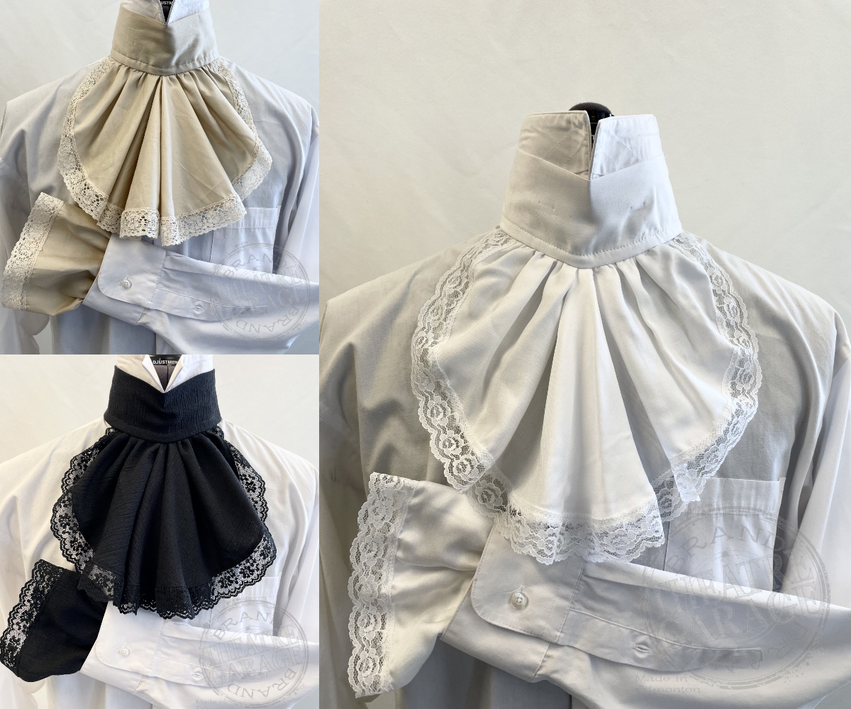 This jabot and cuff set is a great addition to your historical costume. Jabot has a large Velcro closure at the back and wrist cuffs are elasticized.