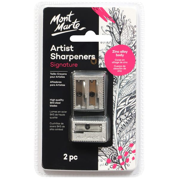 Artist's Sharpener Set contains two zinc alloy sharpeners with finely honed SK5 steel blades. Side grip for comfortable and easy handling. Features: Zinc alloy body, twin barrel and single barrel, finely honed SK5 steel blades. Suitable for use with: Mont Marte Graphite, Colour, Watercolour and Jumbo Metallic Pencils. The twin barrel sharpener sharpens 8mm pencils to a regular point for sketching or writing and the large barrel is for jumbo 10mm sized artist's pencils.