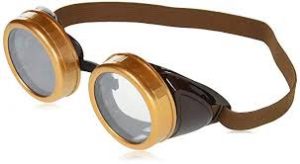 These goggles are sure to complete any Steampunk look! They feature clear aviator style lenses with a shiny silver border. They are on a black faux-leather case for a comfortable fit. They have a adjustable sturdy elastic strap around the back. These goggles can be worn over the head, around a hat or around the neck. Does not provide UV protection. 14+