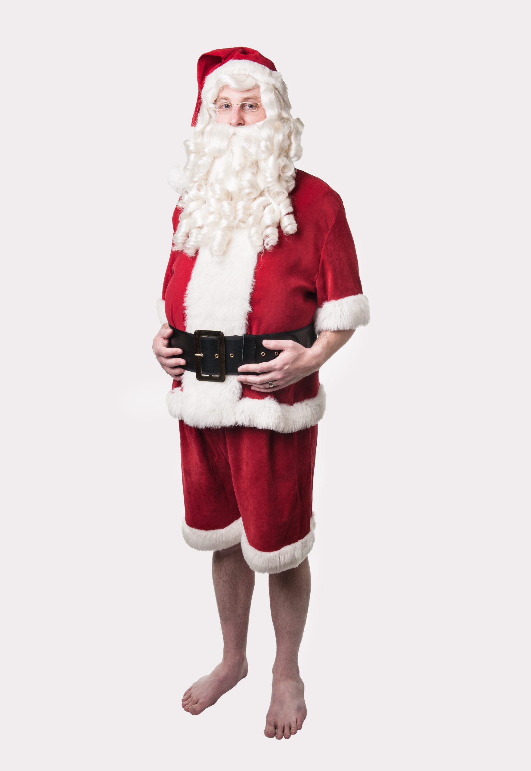 Our Sunny Claus comes with: Short sleeved Santa jacket, matching shorts, tummy stuffer, wig and beard, and glasses.