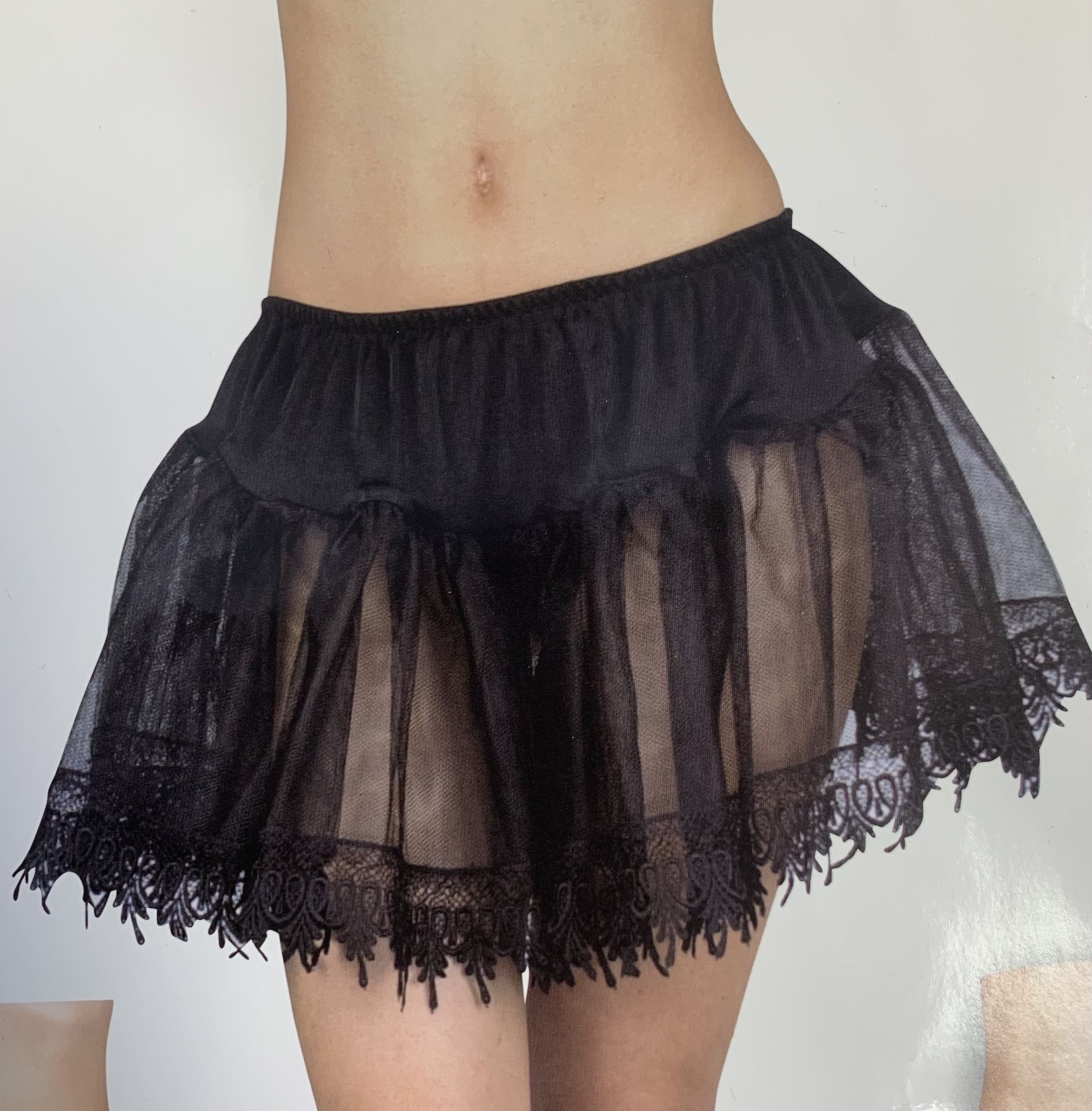 This black crinoline is 95% polyester tulle and 5% spandex with tear drop trim on the hem. Elastic waist measures 23" to 32". Full length of 14"