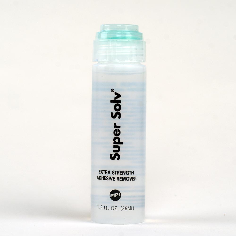 Super Solv is an extra strength adhesive and prosthetic remover. Hydrocarbon based, mildly scented, Super Solv provides rapid removal of adhesives and prosthetics without damage to appliances and latex foam. Excellent for use on delicate lace wigs and skin. Non-oily and not harmful to materials.
