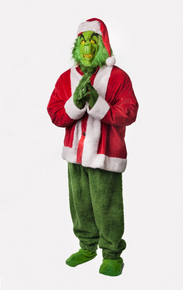 Our Grinch comes with: Mask, Santa hat, Green fur cowl, Santa jacket, Green fur hands, Green fur pants and Green fur foot covers.