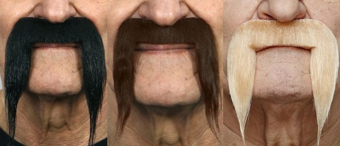 Mustache with self adhesive back. For multiple uses we recommend applying with spirit gum and removing with spirit gum remover. For short periods of wear toupee tape can work as well.
