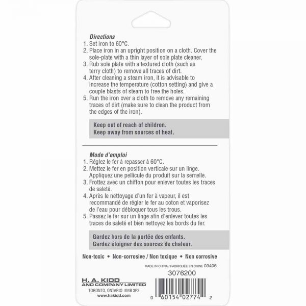 Easily cleans iron sole plates of dirt and debris! Simply rub a thin layer of cleaner on the soleplate and then wipe away with a textured cloth. Non-toxic and non-corrosive.