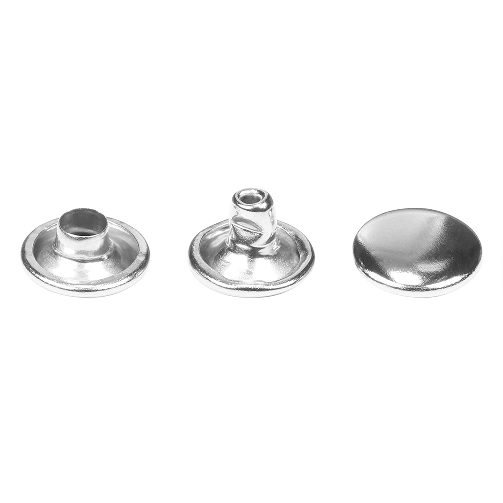 24 double cap rivets with short posts - ideal for use in garment making. Made of nickel plated brass with double cap - both the front and the back have the same appearance. Tool not included