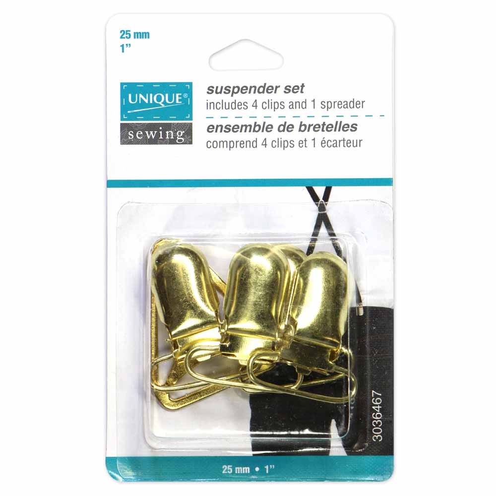 Includes 4 clips and 1 spreader. Use for making x-back style suspenders with 1″ straps. Set includes an adjustable triangle back piece and four metal clips. Can alternatively be used for making mittens and pacifier clips. The clips have prongs that grip tightly and a flip-down guard that locks and protects.