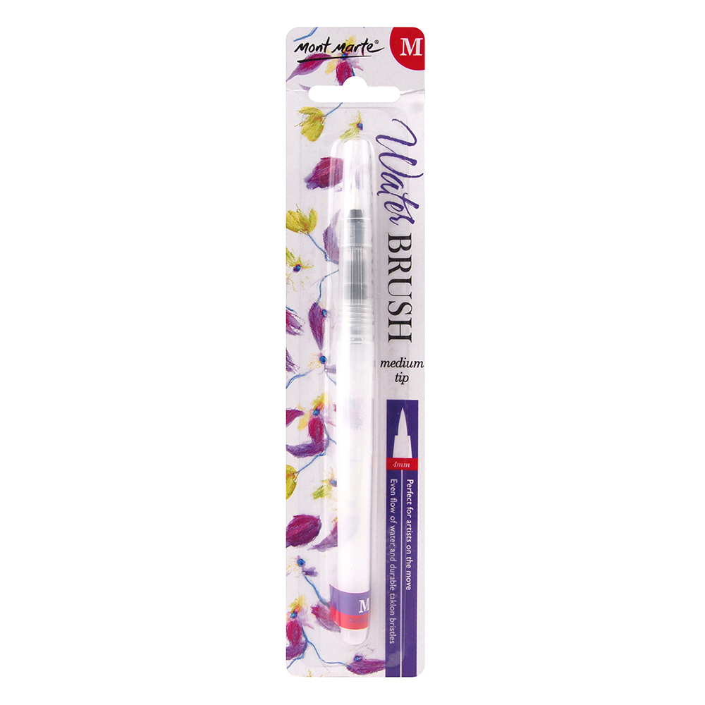 Mont Marte Waterbrushes are ideal for use on the move. The pressure-sensitive barrel delivers an even flow of water via the tip and the durable taklon bristles allow for delicate brush work. They are perfect for use with watercolour pencils and watercolour pans. Medium Tip 4mm. Perfect for artists on the move.